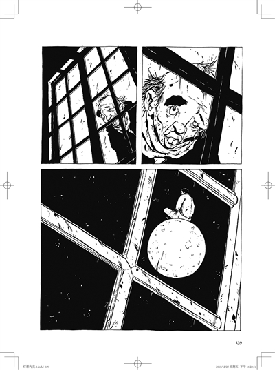 最终,长达六页的慢镜头搭配着明亮的天空,见证了整个故事的尾声:怪人经过长久的思索,决定亲自参与和体会真实的世界,他用绳子打包好行李,鼓起勇气搭上了多年以来给他运送食物的船只。长相丑陋又脱离社会多年的怪人即将面临怎样的生活?障碍重重的现实社会是否能带给他比独居塔中更幸福的生活?作者没有描绘,画面就这样在一场通往未知的旅途中戛然而止,只剩一座孤独的灯塔仍在平坦的海面上悄然耸立。![]()
