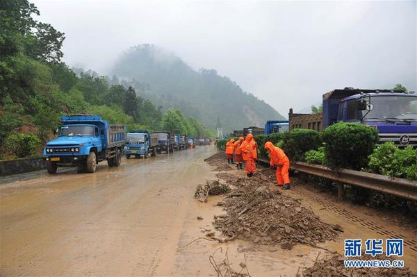5月7日,工作人员在杭瑞高速公路浙江临安白果互通段清理泥石。当日凌晨,强降雨致G56杭瑞高速白果至颊口段突发泥石流,G56高速107公里沿途多处遭受泥石流侵袭,交通中断,数十辆车被阻,几十名司乘人员被困。经过救援人员昼夜连续奋战,截至5月7日中午,受困人员和车辆已被安全转移。新华社发(胡剑欢 摄)