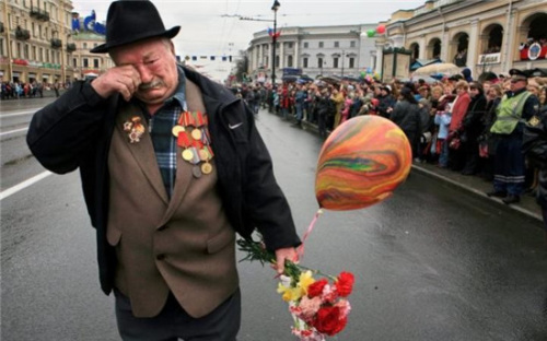 还有一张图片或许同样知名:一名老兵走在游行路上,胸前挂着沉甸甸的勋章,手上拿着鲜花和气球,周围是观看阅兵的群众。但形单影只的他,只能以手抹泪。照片的拍摄者亚历山大·彼得罗相(Aleksandr Petrosyan)称,这张照片拍摄于2007年的圣彼得堡,但他并不知道这位老兵的名字,也不清楚他落泪的原因是否确为网络所述,为了已经全部逝去的战友。