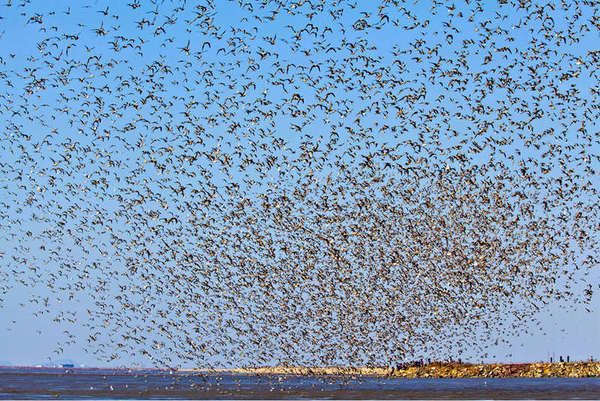 人民网沈阳5月9日电(蒋山)“南去钱塘江畔观潮,北来鸭绿江口观鸟”。近日,辽宁丹东迎来数十万只涉禽汇聚到鸭绿江口湿地。据介绍,这里每年经此迁徙的鸟类达300多种、120多万只,其中有国家重点保护种类45种,最大鸟群可达12万只。