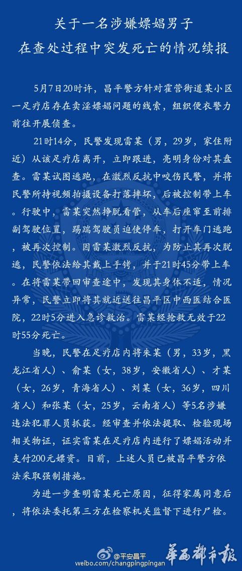 ①7日20时许,昌平警方针对足疗店存在卖淫嫖娼问题的线索,组织便衣警力前往侦查。②21时14分,民警发现雷某(家住附近)从该足疗店离开,立即跟进,亮明身份对其盘查。③21时45分,雷某被再次带上车。④22时5分,被送急诊救治。⑤22时55分,经抢救无效于死亡。