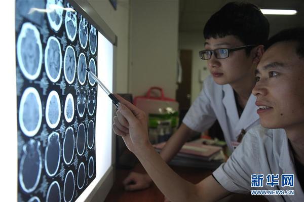 5月10日,在绵竹市人民医院,于占东(前)和同事在康复医学科办公室一起分析病人病情。