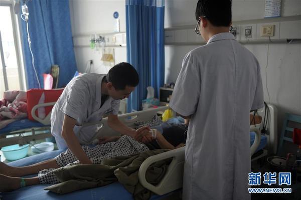 5月10日,在绵竹市人民医院,于占东(左一)为病人治疗。新华社发(金马梦妮 摄)