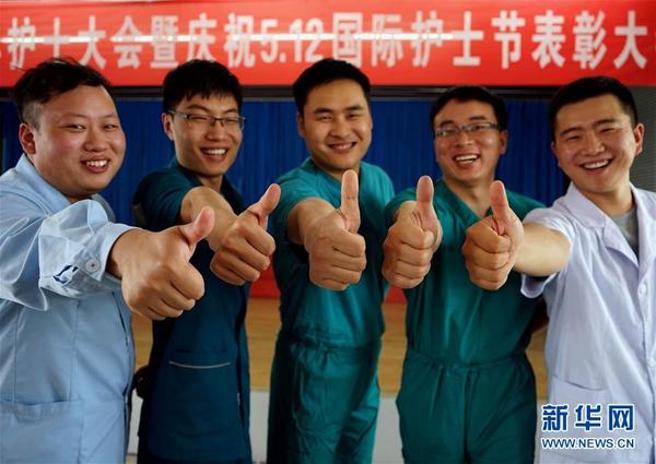 5月11日,河南省汝阳县人民医院的男护士们在护士节活动上竖起大拇指。在河南省汝阳县人民医院400多名护士中,有一支由10名男性护士组成的特殊队伍,被同事们戏称为“女儿国”里的“男丁格尔”。他们凭借着体力好、精力旺盛、思维敏捷、心理素质强等优势,活跃在手术室、急诊室、ICU病房等科室,承担着高风险、高难度、工作量大的任务。他们虽没有燕尾帽,不着护士裙,但在分秒必争的医疗战场上扮演着越来越重要的角色。新华社记者 李安 摄