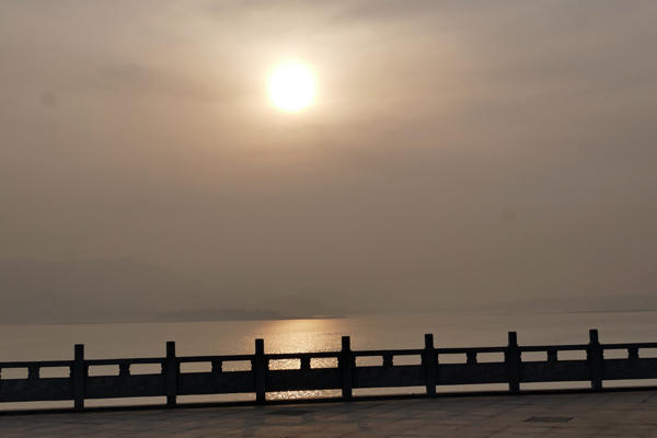 顺着湖边走了走,清晨如此美好。初升的太阳将湖面的渲染的犹如仙境,亭台楼榭画意浓浓。天空宁静湛蓝,飞机拉下的白烟将天空妆点的更加高远。沙滩上的桌椅板凳尚未收拾,昨晚这里是一片假日的欢乐场。