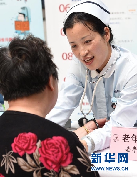 5月12日,鼓楼医院保健中心主管护师房芳(右)为市民量血压并进行护理指导。当日是国际护士节,南京鼓楼医院的30多位护理工作者在医院大厅开展专科护理义务服务活动,为市民和患者提供免费咨询、体检,进行护理指导与操作演示,并赠送护理宣教资料及健康礼品。 新华社记者 孙参 摄