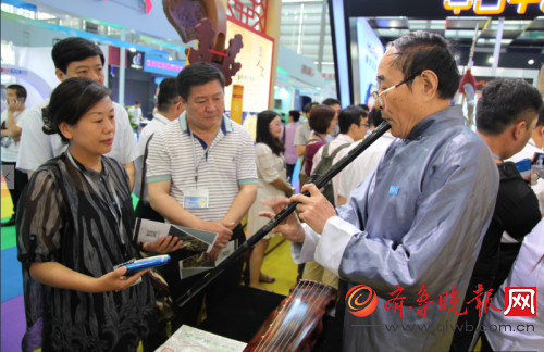 展厅门前的左侧是大型木雕如意,右侧则是木雕孔子像,峄阳孤桐古琴馆馆长戴子清轻抚古琴,静待四方宾客。在12日开幕的深圳文博会上,虽然济宁展厅只有36平方米,但是凭借着深厚的文化底蕴,微山湖荷叶文创、梁山冷兵器、泗滨砭石、嘉祥石雕和鲁锦、集体亮相的三孔文创商品以及众多动漫周边产品,引来了众多参展商的驻足欣赏。