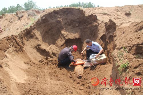 发现这一炸弹后,现场施工被紧急叫停,郯城县公安局抽调民警对炸弹现场周 边进行24小时警戒。经联系确定后,5月11日,临沂市公安局排爆专家张中建从其他 任务中抽身赶到现场,与郯城县公安局民警一起,采取深坑引爆排除法准备准备将 这枚炸弹引爆。