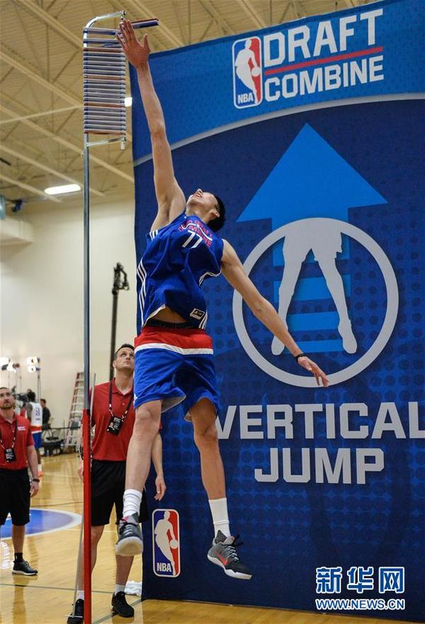 5月12日,周琦在试训中摸高。当日,中国男篮球员周琦在美国芝加哥参加NBA联合试训。 新华社记者鲍丹丹摄