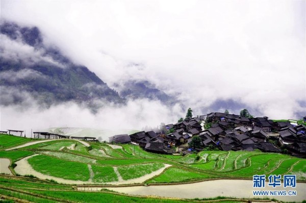这是5月13日拍摄的云雾缭绕的贵州省从江县加榜梯田。连日降雨过后,贵州省从江县加榜梯田风景区云雾弥漫,梯田、吊脚楼和群山仿佛披上一件云裳,若隐若现,美轮美奂。新华社发(刘朝富 摄)