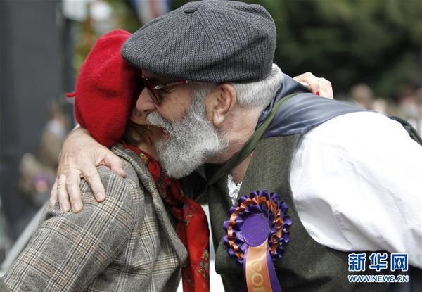 5月14日,在英国伦敦,人们在粗花呢复古骑行活动开始前相互问候。粗花呢骑行是由一群热衷复古风的英国人从2009年开始在伦敦举办的一项骑行活动。参与者必须穿着具有英伦风格的粗花呢套装,并且骑行经典复古款自行车,目的在于唤起人们对轻巧便捷而又有益环境的自行车的怀念和热爱。新华社记者韩岩摄