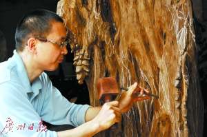 随后几年,凭借之前打下的功底,刘中进创作的一系列名人雕塑摆件及旅游纪念品慢慢赢得了商家的青睐,走出清远销往一些大城市。“然而,因为畅销,又屡次招来盗版侵权,我还专门为此起诉了一家景区和商家,折腾得精疲力尽。”刘中进称,在损失了近百万元巨资之后,他沉寂下来,拿起刻刀,重新出发。现在,刘中进正在筹划清远大型禾雀花、瑶族人文主题的雕刻创作。