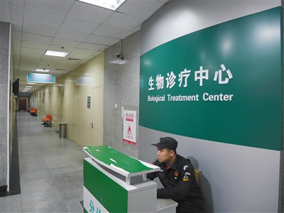 2016年5月2日,武警北京总队第二医院,生物诊疗中心,仅有一名保安在执勤,无医生接诊,挂号也停止了。新京报记者 王嘉宁 摄