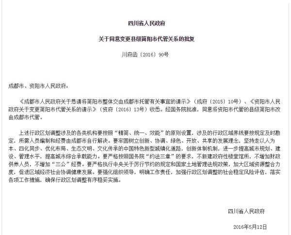 2016年5月16日,四川省人民政府网公布的川府函〔2016〕90号文(简称90号文)显示,经国务院批准,同意将资阳市代管的县级简阳市改由成都市代管。