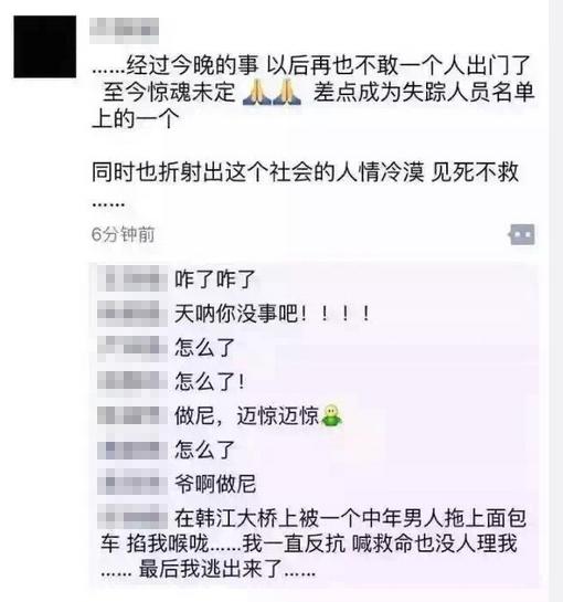 5月16日晚,潮州本地朋友圈被一条女生遭劫持的消息刷屏。澎湃新闻从截图看到,韩山师范学院(潮州)一女学生当晚兼职回校时,在韩江大桥上被一名陌生中年男子“拖拽”、“掐脖”后拉入一辆疑似无牌面包车,女生拼死呼喊救命却无人搭救,其嘴巴一度被陌生男子捂住,所幸有两名男子路过“看热闹”,女生才突围跳下车,面包车随即驶离。