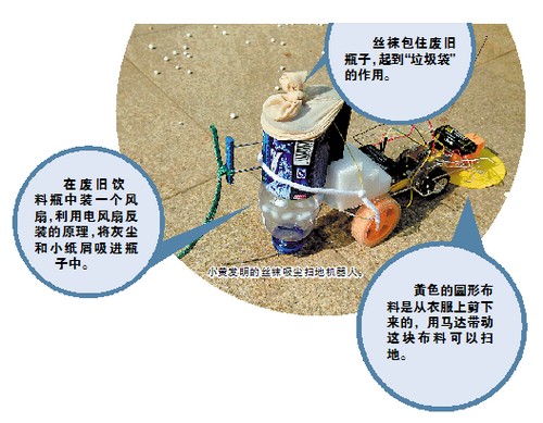 原标题:小学生帮妈妈干家务 发明丝袜扫地机器人