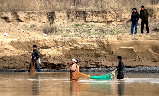 3月9日,济南,在放生点的下游100米处,村民身穿连体防水服,带着渔具站在齐腰深的黄河水中,撒网捕捞刚刚放生的鱼儿。 视觉中国供图