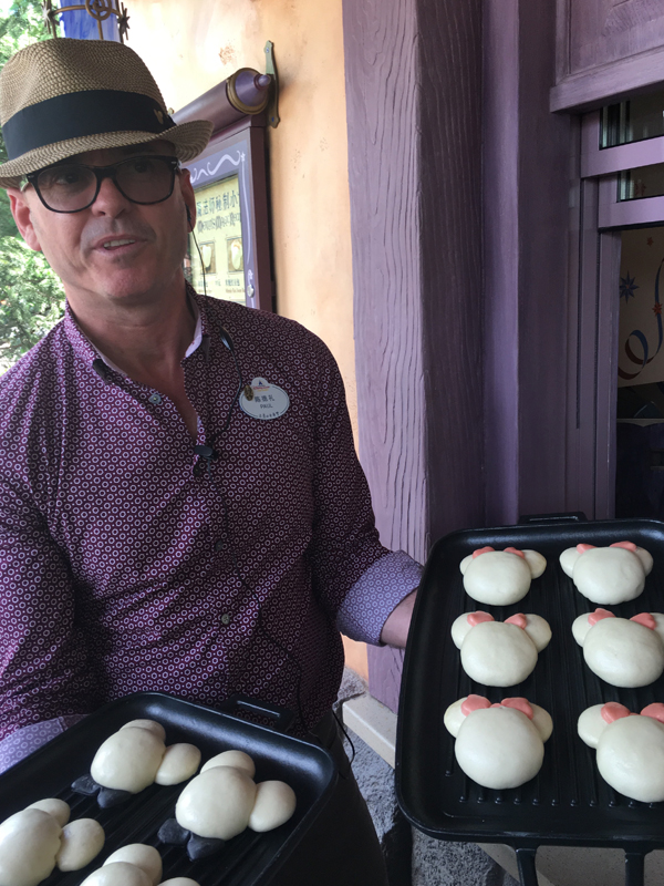 上海迪士尼度假区餐饮总监陈德礼(Paul Chandler)在魔法师秘制小食展示米奇肉包、米妮红豆包