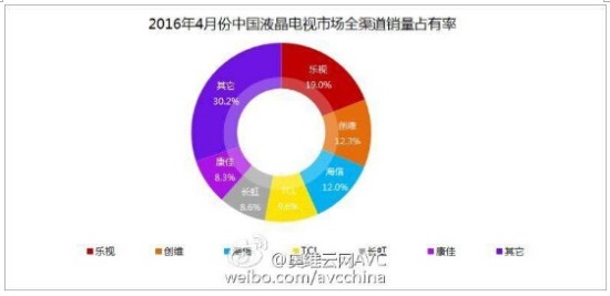 根据奥维云网全渠道数据显示,4月份整体国内整体电视销量374万台,其中乐视71万台占19%,创维46万台占12.3%,海信45万台占12%,TCL 36万台占9.6%,长虹32万台占8.6%,康佳31万台占8.3%。