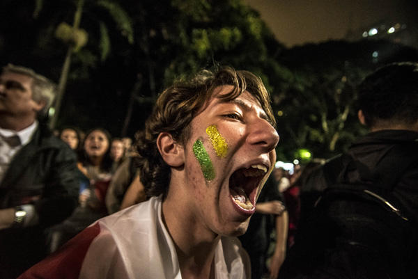 5月11日,人们在巴西圣保罗参加集会,抗议针对总统罗塞夫的弹劾案。 新华社发