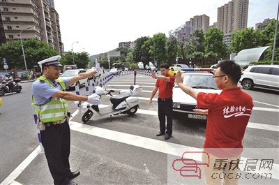 5月17日,沙区警方邀请市民全程体验民警的一天。体验者(红衣者)分别在110民警、交巡警和社区民警的岗位上体验他们的警务工作。本报记者 胡杰 摄