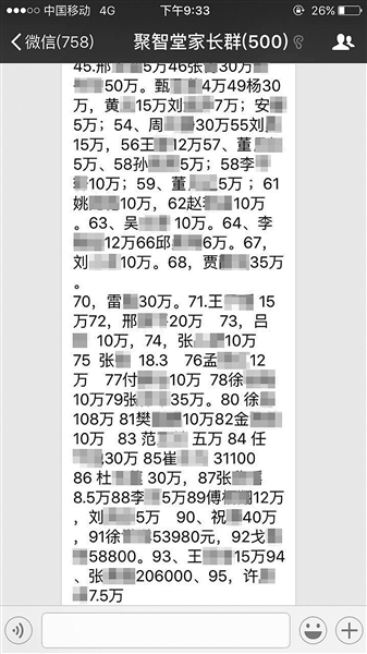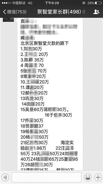 刘某30万、王某某20万……北青报记者了解到,事件发生后,很多家长已经自发组成了一个超过500人的维权微信群。北青报记者在该群中看到,家长们已经在昨天上午开始接力列出聚智堂所拖欠的金额细项。“我们就想尽快地了解事情发展的动态,别让我们的钱就这么没了。”一位家长向北青报记者介绍。