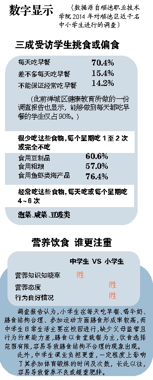 明日是中国学生营养日,佛山一所学校针对中小学生所做的一份营养知识行为状况调查结果显示,受调查的近千名学生中,近三成的学生存在挑食或者偏食的情况。从不同学段来看,中学生良好的营养行为的平均水平要低于小学生。
