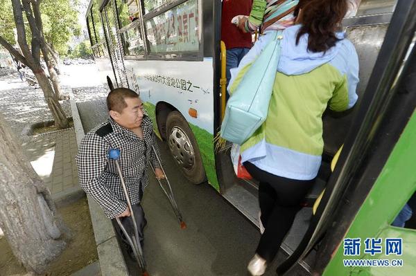 5月18日,在宁夏回族自治区银川市街头的一处公交站,肢体残疾的丁孝忠拄着拐杖准备登上一辆公交车。银川市不少公交车上车的台阶都属于高台阶,这给残疾人的出行带来不便。近日,记者在宁夏银川市走访时发现,包括地下通道、商业街道、商场、小区、公共厕所在内的诸多公共场所的公共设施无障碍程度不高甚至缺失,给残疾人的日常生活出行带来了巨大不便。据宁夏回族自治区残联介绍,近年宁夏无障碍环境建设水平有了明显提高,但与残疾人的需求还不相适应,如无障碍设施、设备管理不到位,侵占盲道和残疾人停车位、堵塞无障碍通道的现象存在,一些公共服务机构的语音字幕提示装置长期闲置不用。宁夏回族自治区残联相关负责人表示,无障碍环境建设是一项综合性的系统工程,涉及城市建设、公共交通等多领域和部门,希望各方能够齐抓共管,加强对无障碍环境的建设和管理力度。新华社记者 彭昭之 摄