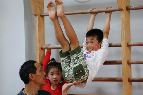 2016年5月4日,杨浦区青少年业余体育学校,一名老师在体操课上指导学生。