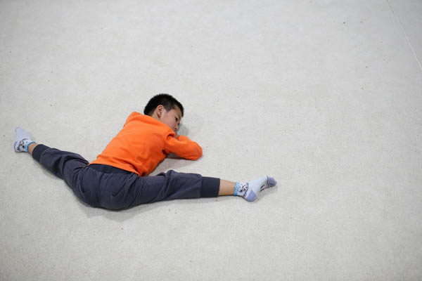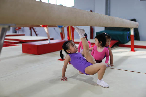 2016年5月4日,上海市杨浦区青少年业余体育学校,女孩在体操课上进行倒立。