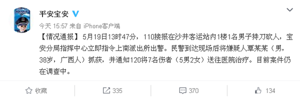 人民网北京5月19日电 深圳市宝安区沙井客运站今天发生一起男子持刀伤人事件,深圳市公安局宝安分局官方微博今日接连发布两则通报,称今天下午13时47分,110接报在沙井客运站内1楼1名男子持刀砍人,民警到达现场后,与巡防队员及客运站保安员合力快速将嫌疑人覃某某(男,38岁,广西人)抓获。经警方进一步核实,嫌疑人覃某某有精神病史。7名伤者(5男2女)已被送往医院治疗,目前伤情稳定,无生命危险。案件仍在进一步调查中。