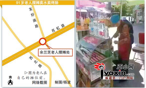 “当你走过西北路(西虹路)有些渴了或者有点小饿时,你可以去西北路(西虹路)7路车上行通道口处买她的水或者烤肠。照片里的老人家96岁了,为了她不能言语的孩子,她坚强地活着!希望朋友们可以给老人多几个赞,买一瓶水,多多支持。”近日,在微信朋友圈和网上,关于老奶奶的信息被大量转发和评论,这位老奶奶是谁呢?