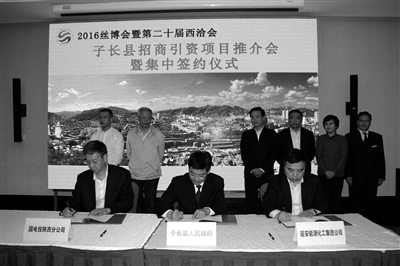 2016年5月13日至17日,2016丝绸之路国际博览会暨第20届中国东西部合作与投资贸易洽谈会在西安举行,来自37个国家和27个省市代表团以及陕西省内的各个代表分团参加。在子长县招商引资项目推介会暨集中签约仪式上,共签订了21个项目,概算总投资197.2亿元,签订项目投资金额之大、涉及领域之广,均创历届西洽会签约最好纪录。