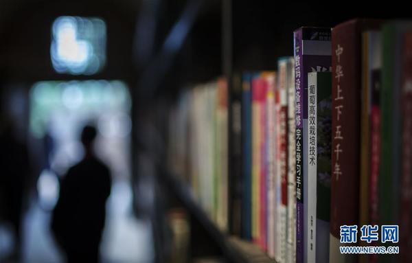 5月20日,一位参观者走进“老苗书馆”。河南省孟州市莫沟村有一家叫做“老苗书馆”的图书馆,由数个荒废的窑洞改建而成,目前依然在建设中的“老苗书馆”已有近万册图书可供读者挑选,并且成为村民和游客休息、学习的好去处。“老苗书馆”完全建成后将24小时对外开放。新华社记者 费茂华 摄
