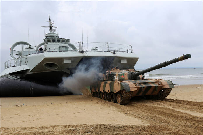 南海演练登陆作战 96A坦克从“野牛”肚里开出