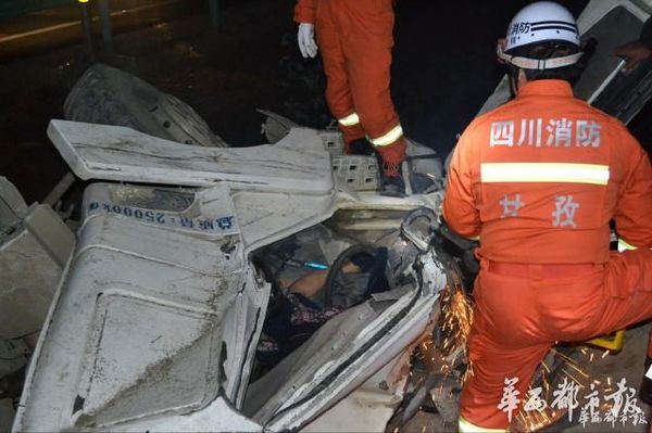 当晚,接到报警的交警和消防队均到场,经勘查发现一辆重型货车侧翻,由于撞击程度过猛,货车车头已经严重变形,有3名人员被困在驾驶室中,驾驶员当场死亡,其余两名神智尚清。