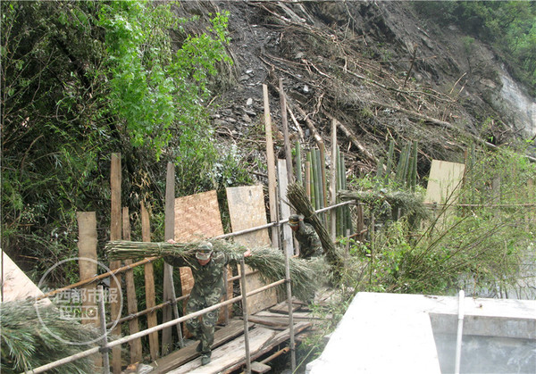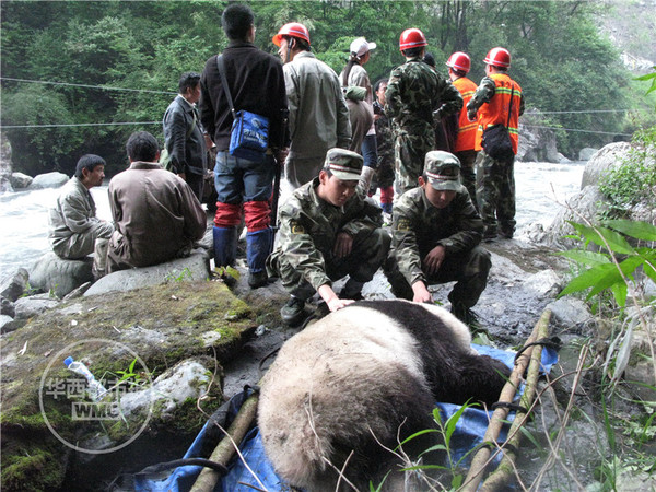 2008年5月19日,武警森林官兵为熊猫搬运竹子。(资料图)