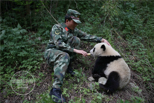 今年5月11日,卧龙森林中队士官王刚和熊猫“苏琳”再度重逢,这个12年的老兵竟难以自抑,流下眼泪。这一天,新建的中国保护大熊猫研究中心四川卧龙神树坪基地“中华大熊猫苑”正式开园,8年前转移出去的部分熊猫,重新回到卧龙故乡,开始新的生活。雷跃军 华西都市报记者 李逢春 图由武警森林支队提供
