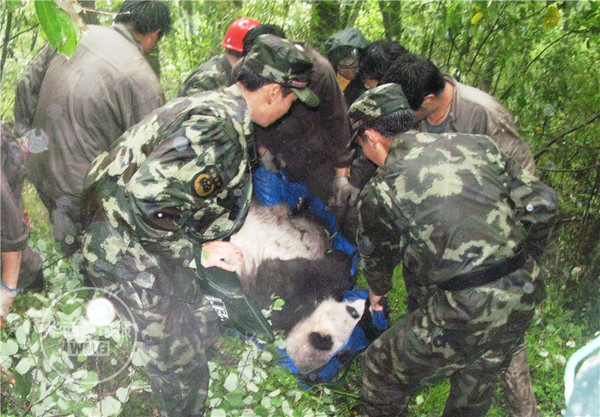 2008年5月26日,武警森林官兵抢救因地震走失的大熊猫。(资料图)