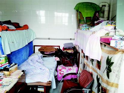 记者看到,这间卫生间面积不到10个平方米,3张单人床占去了一大半的位置,3张床之间挤得没有空隙,不得不摆成两边高、中间低的形状。多出的一张床,是儿子来看望父母时睡的。