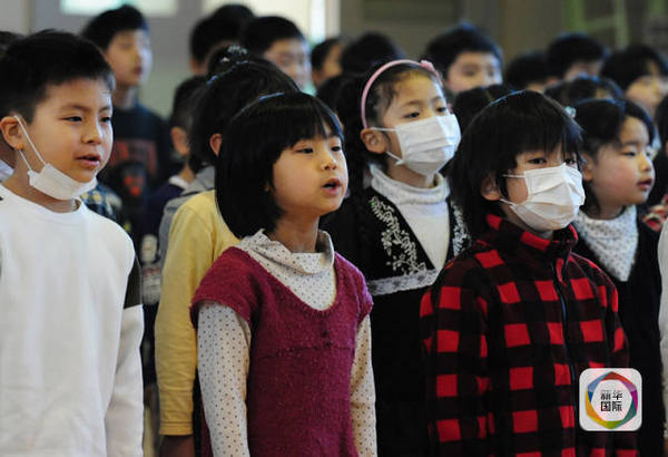 2011年4月6日,在福岛县福岛市立第一小学,学生们在开学仪式上唱校歌。福岛县2011年4月5日开始,对县内离第一核电站20公里外的1600多个中小学、保育所进行放射线量的测量,称绝大部分校园对孩子健康无影响。新华社记者季春鹏摄
