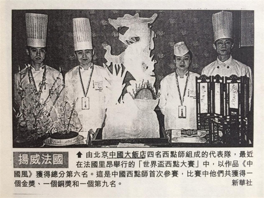 中国人做中餐拿大奖是理所当然,中国人做西餐能得世界级大奖就非同寻常了。所以,当北京中国大饭店作为首批中国参赛队在久负盛名的法国里昂“世界杯西点大赛”中摘取金牌时,这一消息立即成为首都中外记者的抢手新闻。
