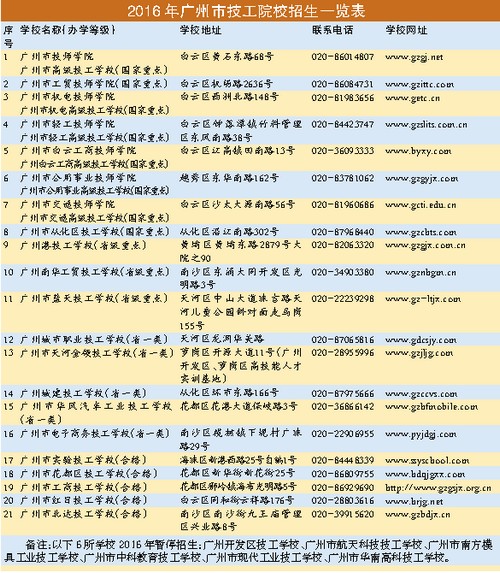 “广州市技工院校2016年计划招生3.6万人,开设有高端制造、智能装备、交通运输、信息技术、电子商务、文化创意、现代农业等11个领域126个专业,毕业生就业率保持98%以上。”广州市人社局技工教育管理处负责人介绍,广州技工教育已有64年发展历史,自1952年第一所技工学校成立以来,一直坚持技能为本,市场导向,不断深化与职业资格体系的对接,在专业设置、课程安排、教学创新等方面进行探索,深化产教融合,以校企合作为技工院校的基本办学制度,培养了数以万计的技术技能人才,造就了技能精英的出彩人生。截至今年3月,全市共有技工院校27所,其中技师学院7所、国家级重点技工学校1所、省重点技工学校3所、省一类技工学校5所、普通技工学校11所。在校教职工5113人,全日制在校生11.3万人,其中高级工班、预备技师班学生6.5万人,80%为农村和城市贫困学生,每年政府投入减免学生学费和发放国家助学金的财政补助约3亿元,设有126个专业群,与省内18个工业园区、3000多家企业建立了深度合作关系,年毕业生近3万人,就业率98%以上,年社会培训鉴定10.3万人次,是我市落实促进就业政策和技能人才培养的重要基地。