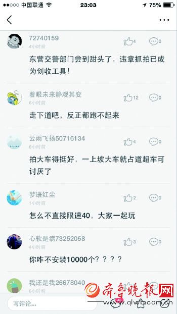 公告一经发出,在网上引起不少市民的热议,有许多网友留言称:“时速90-100公里,这车速要控制好了也是需要技术的!”、“为啥周边地区都是120,就东营100,建议把这些摄像头安装在小区和市区里,为市民财产安全保驾护航”、“左侧车道限速90到100,我也是醉了,还不如跑国道呢,每次从垦利回烟台老丈人家都要跑整段东营段,堵的跟市区似的”、“走下道吧,反正都跑不起来。”等等。