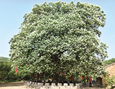 佛祖得道于菩提树下,涅槃于娑罗树下。菩提树象征着向善而得道,娑罗树则象征着守信而圆满。生长在宜君县太安镇艾蒿洼村的玄奘手植娑罗树,学名七叶树,属七叶树科七叶树属,是陕西省境内目前发现的唯一一株娑罗古树。这棵古树生长茂盛,有1300余年树龄,高约20米,胸围约380厘米,平均冠幅24.5米,占地面积600平方米,树冠大而圆。5月开花,9月成果,花白芬芳,像佛塔,似烛台;果分阴阳,半红半黄;干如僧臂,叶似佛掌。开花时节,景观奇美,似满树佛手捧烛,祈福人间。