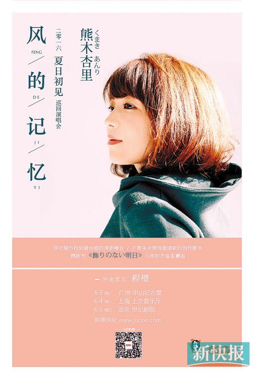 新快报讯 记者贺雅佳报道 6月3日起,日本治愈系歌手熊木杏里将登陆广州、上海、北京带来首次中国巡回演唱会《风的记忆》——熊木杏里夏日初见巡回演唱会。虽从未在国内有正式的演出,但熊木杏里凭借其独有的透明、纯净、质朴的音色,及清新温柔、朗朗上口的曲风,已在国内拥有坚定的歌迷基础,同时被歌迷亲切地称为“小熊”。创作女歌手程璧,将作为特邀嘉宾现身上海、北京、广州三站,现场更将带来从未发行过的新单曲《向着明亮那方》。