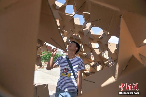 5月30日,昆明理工大学校园内展出的学生用纸板搭建的创意建筑吸引了往来学生们的注意。这是27日至29日在该校举行的建筑文化节暨第一届云南省大学生建造节——“纸板聚落”建筑设计及建造竞赛的作品展示,比赛吸引了来自云南师范大学、云南艺术学院、西南林业大学等8所高校的23支参赛队。中新社记者任东 摄