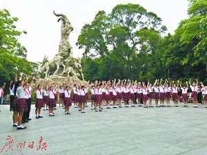 5月18日,越秀区东风西路小学合唱队在越秀公园五羊雕塑前演唱《歌声与微笑》,歌唱美丽广州。