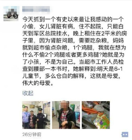 【最心酸的儿童节礼物:母亲给生病的女儿偷鸡腿】昨晚,南京警方抓获一小偷,她到超市偷了一点杂粮、一个鸡腿、一本儿童读物。女子交代,自己生了双胞胎女儿,肾脏都有问题,老公因此离家出走。这次带一个女儿来南京看病,“孩子说想吃鸡腿,可我身上只有5块钱…”(现代快报)