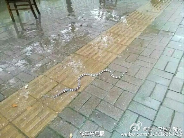 【武汉普降大到暴雨内涝严重 蛇鱼齐"上街"】6月1日凌晨3时至上午10时,武汉市遭遇大到暴雨。 部分路段出现渍水,对交通造成一定影响,水务部门正在积极组织抢排。网友打趣,武汉下大雨了,华科的池塘水满了,雨和蛇都出来了,池塘的生物可丰富了,比如银环蛇,鳝鱼,鲫鱼……(中国新闻网)